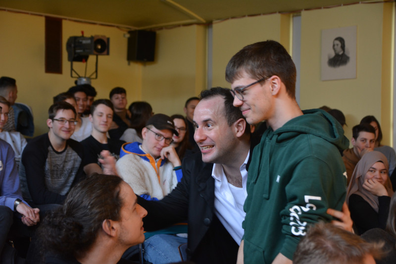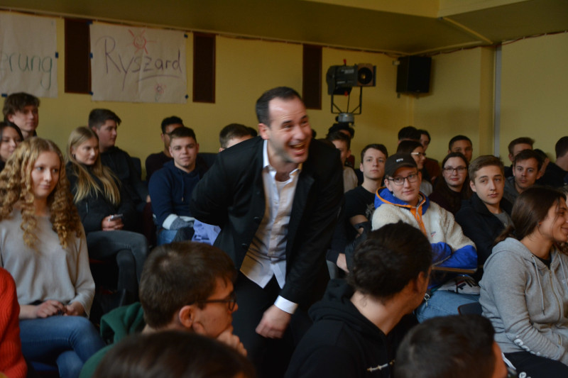Dabei werden die jungen Zuschauer immer wieder aufgefordert, dass Geschehen auf der Bühne durch Klatschen, phonetische Bekundungen oder einfach durch lautes Schreien von „Scheiße“ im Chor zu begleiten. Untebrechungen werden von Steffen Schlösser genutzt, um den Gymnasiasten Fragen zu stellen. „Welches Gift soll Faust verwenden?“ „Was ist ein Drudenfuß?“ oder „Wo befindet sich Auerbachs Keller?“