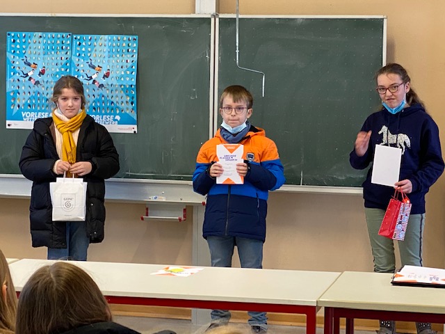 So hatte die Jury, in der neben den Lehrer_Innen auch Lucie und Frau Kretzschmar (SEB) vertreten waren, einige Mühe zu entscheiden, konnte sich schließlich aber doch klar auf eine Siegerin einigen: Sophia kommt nun die große Aufgabe zu, in die Fußstapfen Lucies zu treten und das Röka über möglichst viele Stationen hinweg beim Vorlesewettbewerb 2021/22 zu vertreten. Wir wünschen ihr dafür viel Erfolg!