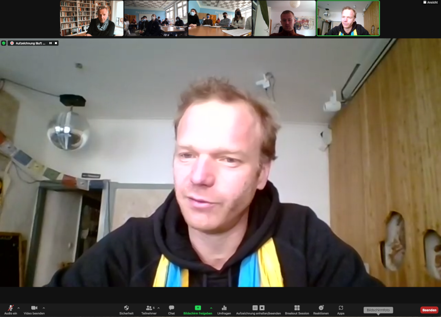 Nun hatte der Kurs das große Glück, dass eine der Praktikant*innen im Sommer zu Besuch auf dem landwirtschaftlichen Betrieb „Biorena“ 30km südlich von Lwiw in der Westukraine von Tim Nandelstädt und Torben Reelfs war und Tim für ein Gespräch mit der Klasse gewinnen konnte.