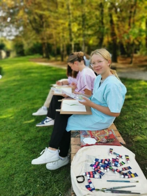 Nachmittags wurden wir von der netten Kunstlehrerin des Collège de Brou, Mélanie, in die Kunst des impressionistischen Malens eingeführt, und setzten das erworbene Wissen direkt mit Pinsel, Farbtuben, Paletten und Kittelschürzen im nahegelegenen Park beim Malen von Naturmotiven um. Schüler*innen und Lehrkräfte waren eifrig und konzentriert bei der Sache, wobei Fluss, Gras, Blätter, Bäume und Himmel auf unterschiedlichste Weise auf die Leinwand gebannt wurden. Vorübergehende Passanten sprachen uns an und bewunderten die Kunstwerke, die nach einer Trockenphase am nächsten Tag mit nach Hause genommen werden durften.