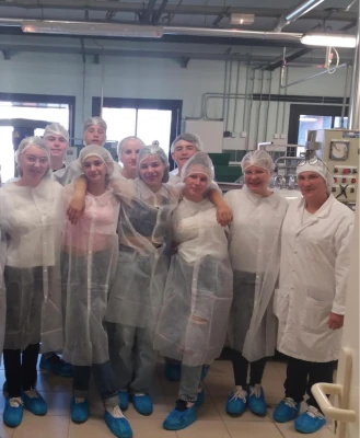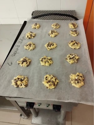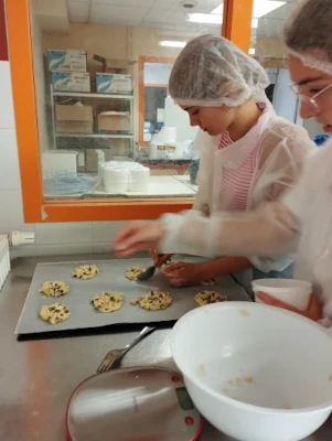 Und schon war der letzte Tag gekommen… O-Ton einer Schülerin: “Die Zeit ist ja viel zu schnell vergangen; jetzt habe ich mich so gut eingewöhnt und würde noch sehr gern viel länger hierbleiben!” An diesem Mittwoch wanderten wir zum Lycée agricole Les Sardières, einem landwirtschaftlichen Gymnasium, das u.a. auf die professionelle Verarbeitung von landwirtschaftlichen Produkten zu Konsumgütern vorbereitet, wie z.B. Pâté, Konfitüren, Fruchtsäfte, Backwaren u.Ä. Nicht jede/r war begeistert, bei der Besichtigung des Lycées rohen Pâté zu sehen und zu riechen und sich erklären zu lassen, wie Fleisch verarbeitet wird… Die im Lycée hergestellten Waren konnten in einem kleinen Lädchen käuflich erworben werden, wovon wir alle regen Gebrauch machten - galt es doch, noch Mitbringsel für die Familie zu Hause zu finden… Das Highlight dieses Tages war jedoch das Backen von Cookies in der Lehrküche, ausgestattet mit produktionsgerechter Schutzkleidung (Hauben, Kittel und Überschuhe - “Bitte bedeckt Eure Frisuren vollständig mit den Hauben, es dürfen keine Haare herausschauen!”) Spaß hat laut Alina dabei am meisten gemacht, dass wohl heimlich an den zum Backen bereitgestellten Schokotropfen genascht wurde… “Man muss ja auch mal was Verbotenes machen!” Isabelle, die nette Lehrerin, die uns beim Backen anleitete und begleitete, kümmerte sich um die Fertigstellung unserer Produkte im Backofen und um die sachgerechte Verpackung (samt Rezept), so dass wir bei der Abfahrt am nächsten Morgen um 8.00 Uhr alle unsere Tüten voll duftender Cookies in Empfang nehmen konnten, womit ja dann auch der Reiseproviant gesichert war!