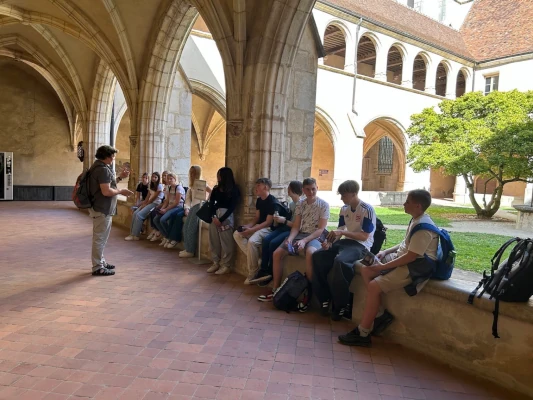 In der Stadt Bourg haben wir viele schöne Orte und Sehenswürdigkeiten angeschaut, z.B. die Église de Brou und den wunderschönen großen Springbrunnen auf der Place Bernard, wo wir auch nette und lustige Fotos machen konnten. Wir waren auch sehr sportlich unterwegs, sind viel gelaufen oder waren am letzten Nachmittag vor der Abfahrt im Schwimmbad. Auch die Shoppingbegeisterten unter uns kamen voll auf ihre Kosten - in der Stadt fand jeder und jede etwas für sich.